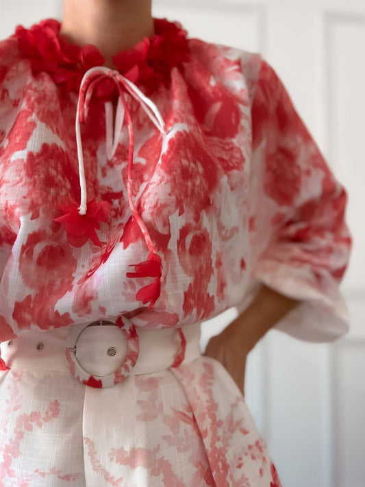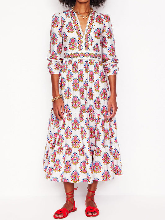 Print V-Neck Smocked Waist Bell Sleeve Dress