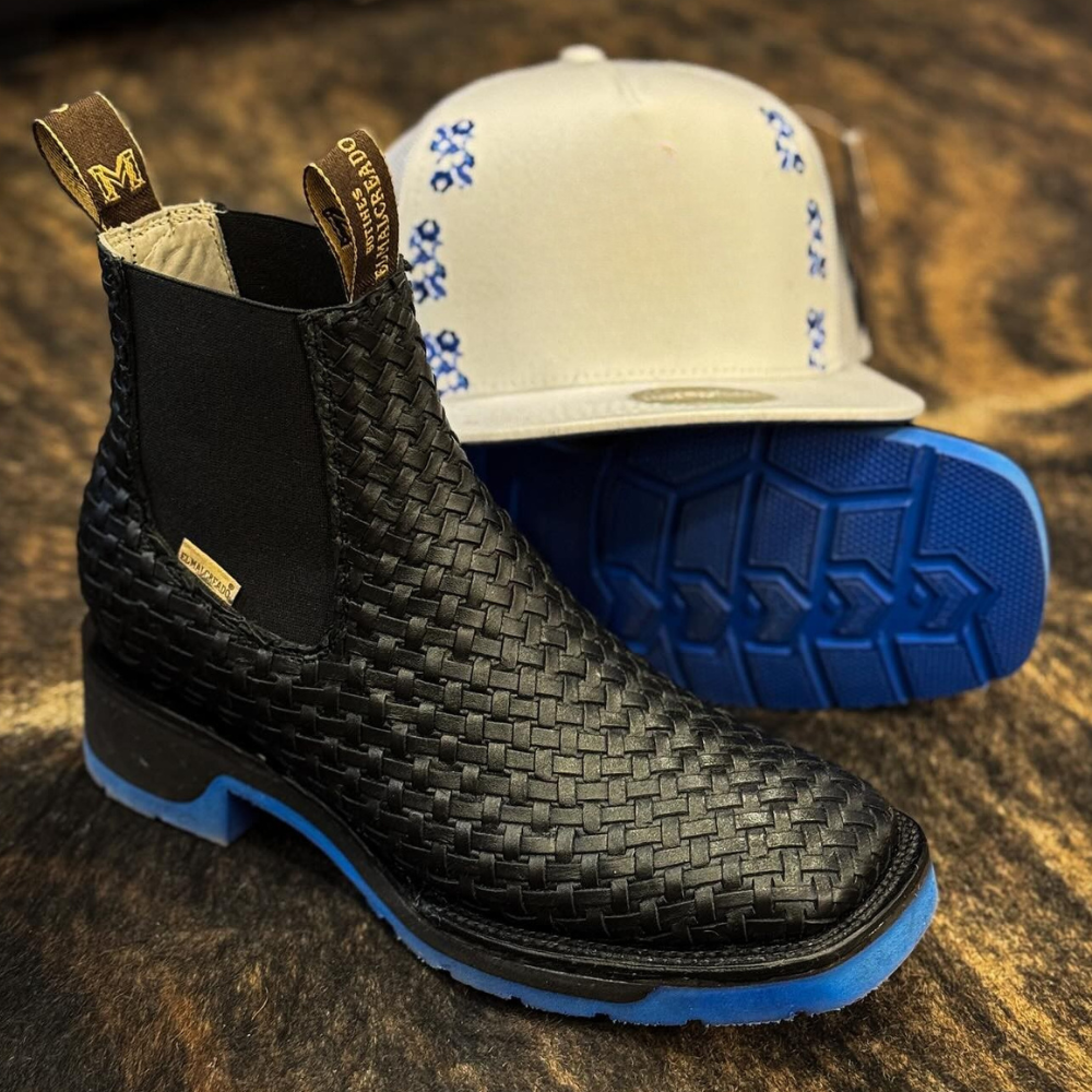 Black Woven Leather Cowboy Boots With Contrasting Red Sole